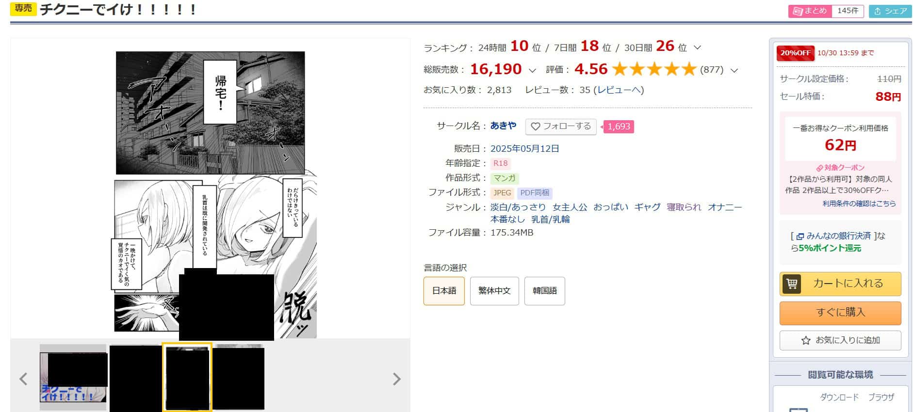 安全かつ安く『チクニーでイけ!!!!!』を読みたい人は、DLsiteのクーポン価格62円が最安値です。