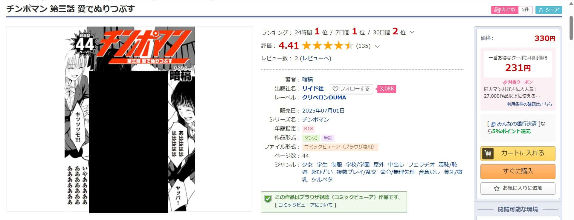 安全かつ安く『チンポマン 第三話 愛でぬりつぶす』を読みたい人は、DLsiteのクーポン価格231円が最安値です。