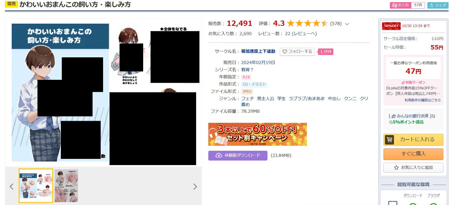 安全かつ安く『かわいいおまんこの飼い方・楽しみ方』を読みたい人は、DLsiteのクーポン価格47円が最安値です。