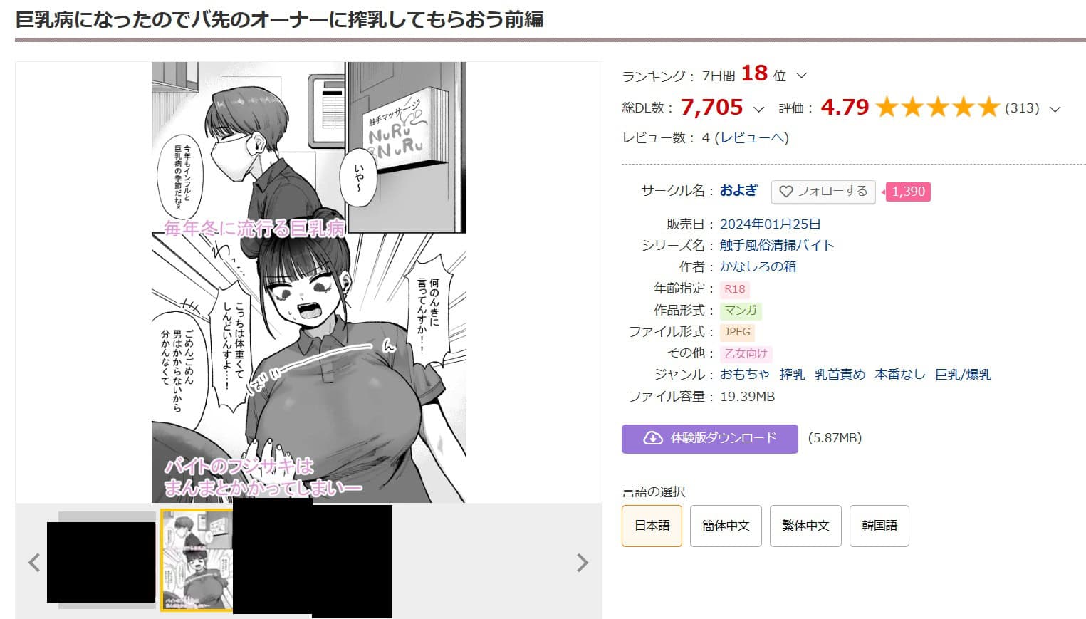 安全かつ安く『巨乳病になったのでバ先のオーナーに搾乳してもらおう』を読みたい人は、DLsiteのクーポン価格352円が最安値です。