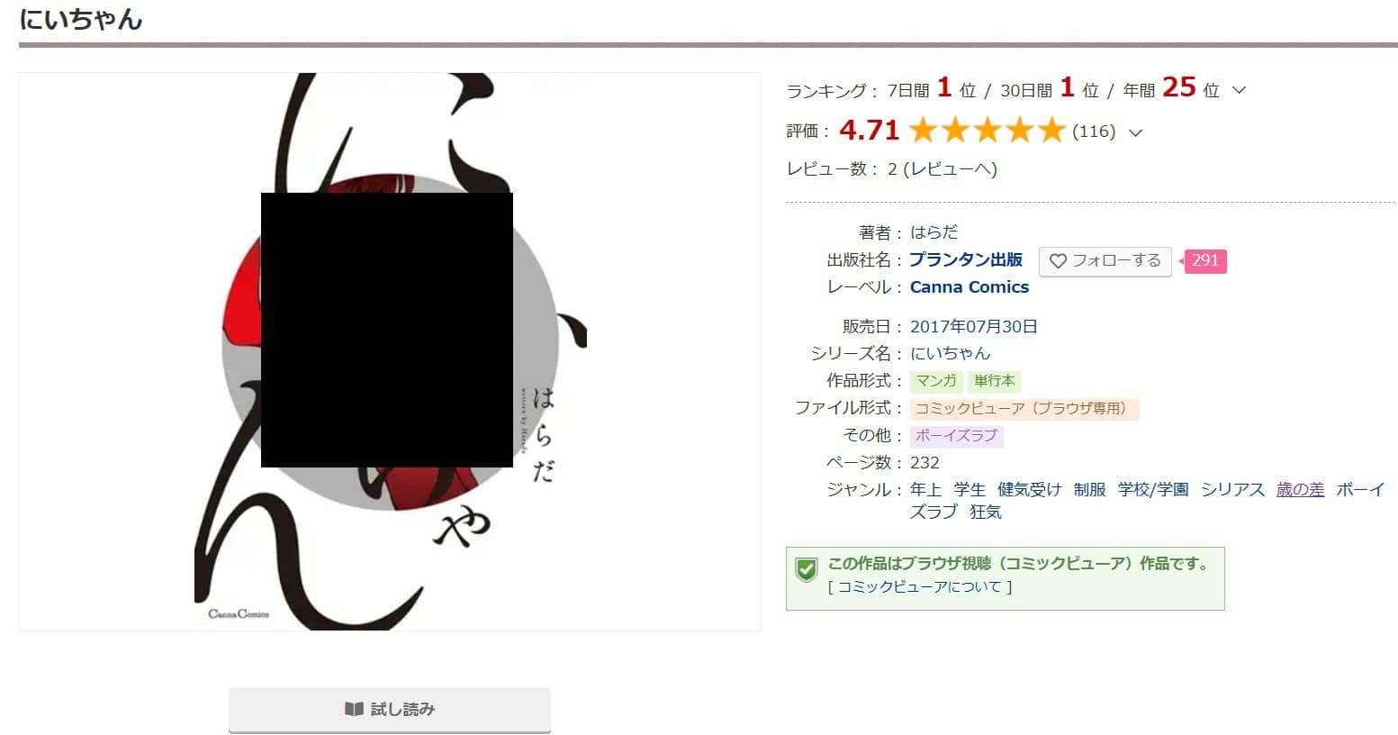 『にいちゃん』は成人向けコンテンツとして正規に販売されている漫画作品です。