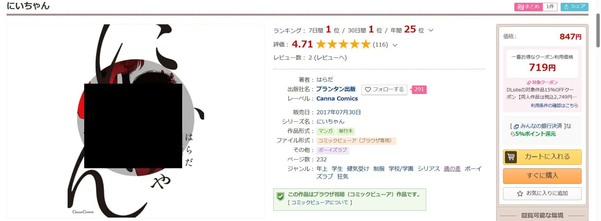 安全かつ安く『にいちゃん』を読みたい人は、DLsiteのクーポン価格719円が最安値です。