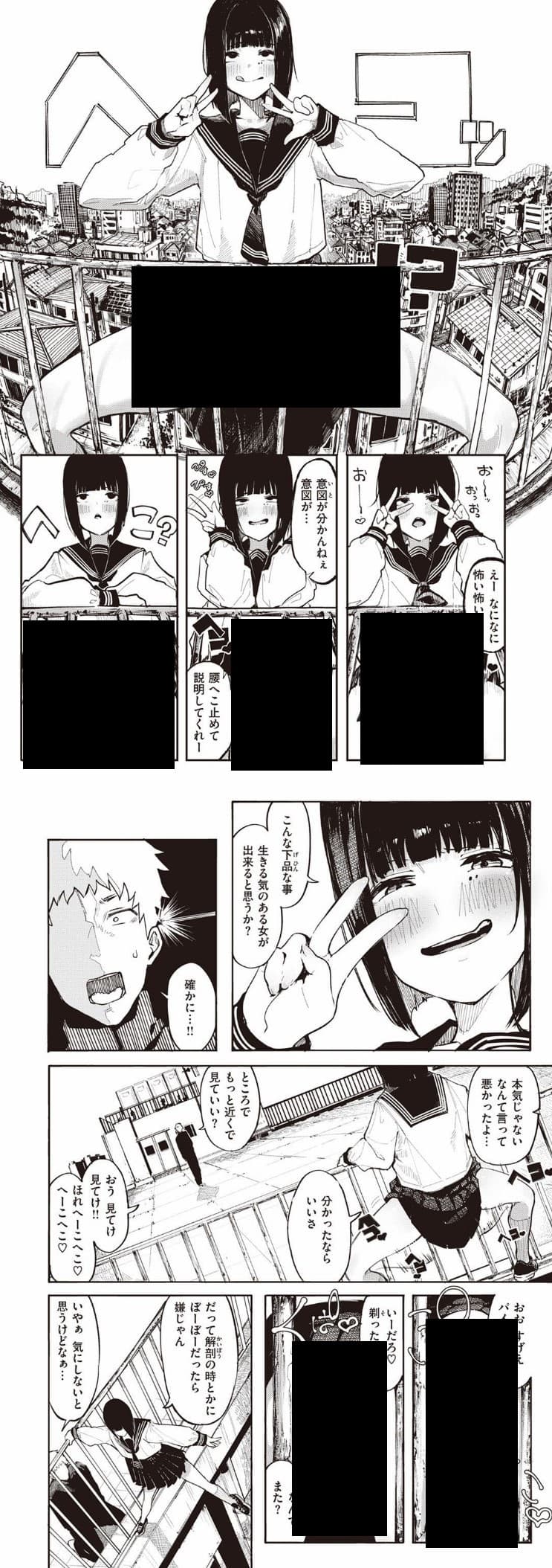 屋上への扉を開けたら屋上の柵を越える女の子。煽り煽られ、紆余曲折行為に至ります。彼らの結末ぜひ見てください。落ちるか心配な方は安心していいと思います、途中というか、ずっと危ないですが堕ちるだけです。