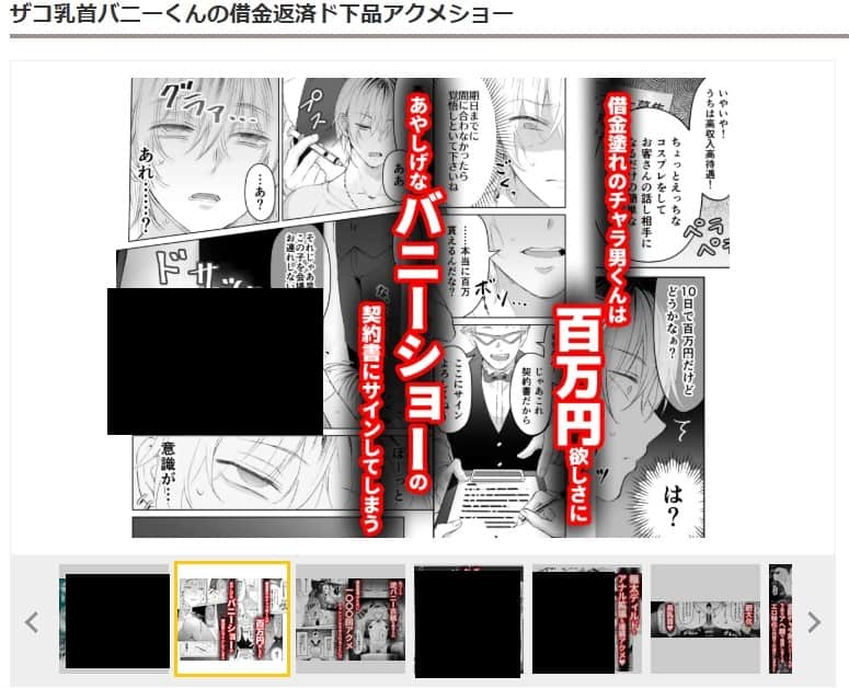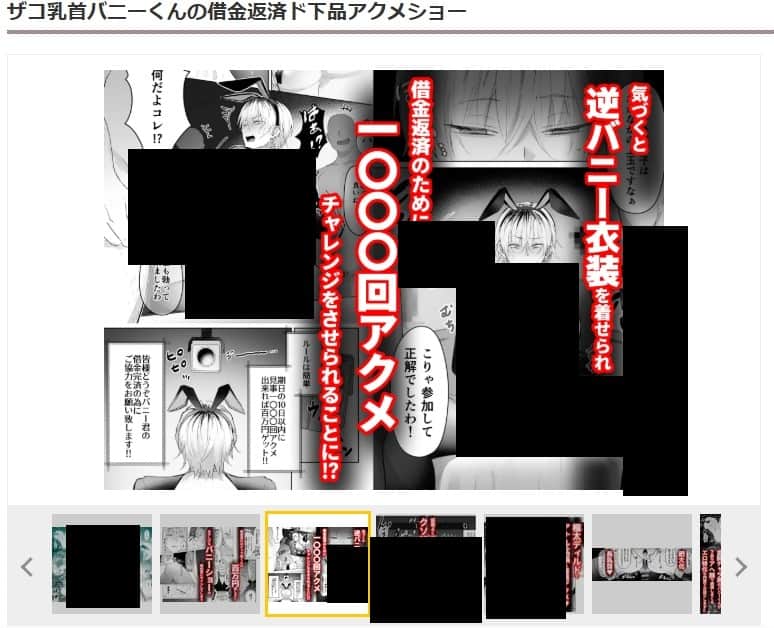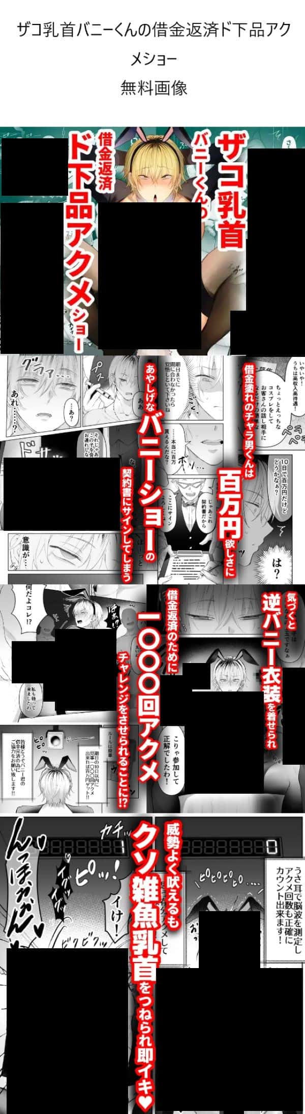 『ザコ乳首バニーくんの借金返済ド下品アクメショー』は成人向け作品として販売されている漫画で、いくつかのサイトから読むことができます。